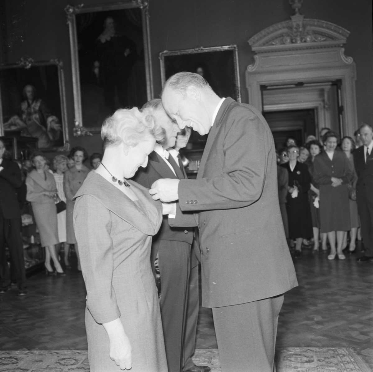• Professor Torgny Segerstedt medaljerade tre av universitetets trotjänare vid en ceremoni i kanslersrummet, Uppsala 1960