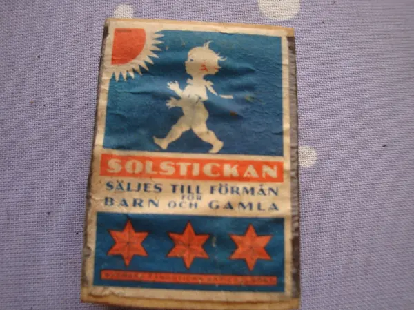 • Tändsticksask med texten: Solstickan, säljes till förmån för barn och gamla.