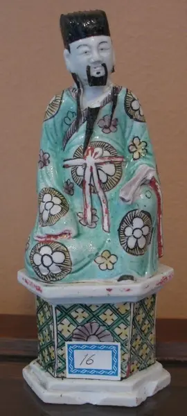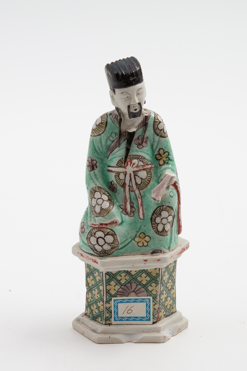 • Figur i porslin föreställande en kines, sittande på en färgad ornamenterad sockel. Har en grön glaserad dräkt målad med blommor. Omärkt.