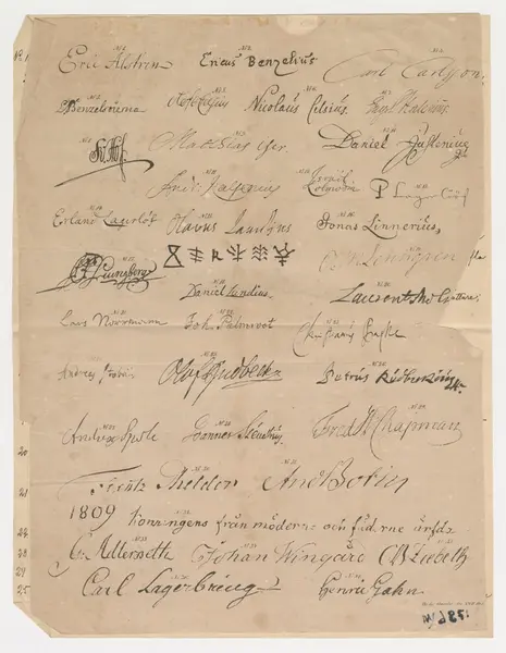 Pappersark med autografer från 1600 och 1700-talen. 1 Eric Alstrin. Biskop i Strängnäs 1721 2 Eric Berzelius, Ärkebiskop 1692 3 L Benzelstierna Biskop 1794 4 Carl Carlsson Biskop i Västerås 1683 5 Olof O Celsius Biskop i Lund 1794 6 Nils Celsius Astronom Professon Uppsala 1721 7 Eng. Halenius Biskop i Skara 1794 8 Sv Hof Lector i Skara Proffessor skref 1748 9 Matthias Tser Biskop i Västerås 1715 10 Daniel Juslerrius Biskop i Skara 1748 11 Andr. Kalserrius Biskop i Västerås 1728 12 Isr. Kolmidin Superintendent 1685 13 P. Lagerlööf Riks Historiegrad & Skald d. före 1687 14 Erland Lagerlöf Professor 1693 15 Olaus Laurelius Biskop i Västerår 1636 16 Jonas Linnerius Biskop i Lund 1693 17 C. F. Ljungberg Domprost i Strängnäs 1732 18 Daniel Lunndius Biskop i Strängnäs 1732 19 Anna Maria Lenngren skrev i Amarantherordens Matrikel 1791 20 Lars Molin Domprost i Uppsala, en af grundläggarna af 1719 års regeringsform 21 Lars Norrmann Biskop i Göteborg, stor latinsk vältalare skref 1685 22 Johan Palmroot Professor i Uppsala 1721 23 Christian Popke Biskop i Lund 1693 24 Andreas Stobaeus Professor i Lund 1693 25 Olof Rudbeck d. y. Archiater 1721 26 Petr Rudbeckius Biskop i Skara 1685 27 Andreas Spole Professor i Uppsala Matematiker 1686 28 Joannes Steuchius Ärkebiskop 1721 29 Fredrik H Chapman v. Amiral skrif före 1772 30 Frantz Sheldon Skeppsbyggmästare skrifet d 15 februari 1801 i Amaranth o-s Matrikel 31 Anders Botin Historiker dito 1760 32 Är ett prof på handstilen i Bergsrådet N. Dalbergs uppsatser; för att lemna dem tillfälle att jämnföra som ega handskrifter ag bemätte D. och som skulle kunna tvifla på autenciteten. 33 G. Adlerbeth. Stats Råd Virgilii öfversättare ur A. O-s matickel före 1775 34 Joh Wingård Biskop i Göteborg ur A O-s matrikel 1782 35 C. B Ziebeth Hof Canzler 1785 36 Carl Lagerbring Grefve Statsråd 37 Henrik Gahn Öfverläkare Skyddskoppornas införande i Stockholm. Ur a. O-s Matrikel före år 1735. Under No 15 ser man sexmännes i Danmarks socken bomärken: Det första (hammartecknet?), Per Anderssons i Hammarby; det adra (Bergafsatsernas?), Bengt Anderssons i Berga; det tredje (personmärke), Rasmus Thomassons i Ekeby; det fjärde (en tall?), simon Carlssons i Säby; det femte (en gran?), Erik Hansson i Wedyxa; det sjette (en Krona?), Bengtssons i Danmarksby. För denna, som första tillbörlig vigt vi Bomärken, heraldikens brodd torde dessa tecken ej sakna intresse. Sexmän voro en slags kommunala ordningsmän, de utförde sockenstämmobeslut, utförde kallelse till kyrkoråd, upptogo böter, som ålades för öfverflöd vi bröllop, barndop och graföl o. s. v.