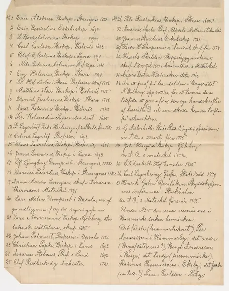 Pappersark med autografer från 1600 och 1700-talen. 1 Eric Alstrin. Biskop i Strängnäs 1721 2 Eric Berzelius, Ärkebiskop 1692 3 L Benzelstierna Biskop 1794 4 Carl Carlsson Biskop i Västerås 1683 5 Olof O Celsius Biskop i Lund 1794 6 Nils Celsius Astronom Professon Uppsala 1721 7 Eng. Halenius Biskop i Skara 1794 8 Sv Hof Lector i Skara Proffessor skref 1748 9 Matthias Tser Biskop i Västerås 1715 1...
