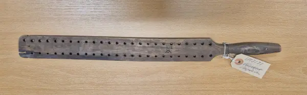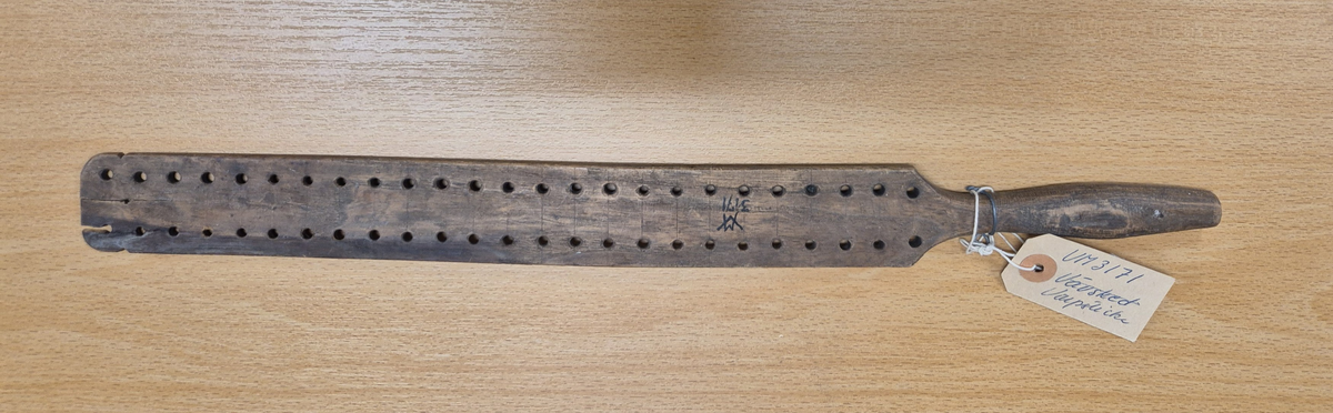 • Vävsked av trä med tätt borrade hål samt försedd med handtag. 03 168-03 176 köpta av S. P. Johansson Bollungsnäs, Sundals Ryr socken, Dalsland för 6 kr.