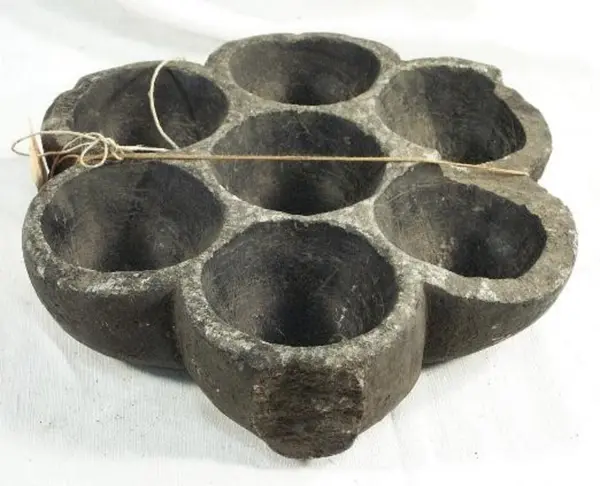 • Det av en munkpanna i täljsten. Sju stekhål. Handtaget avslaget.