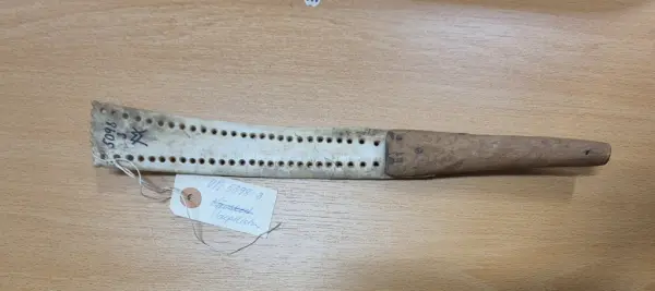 • Vävsked/varpsticka av ben, bestående av en 24 cm lång utskuren rad med två rader av hål. Tvärt avbruten i ena ändan.