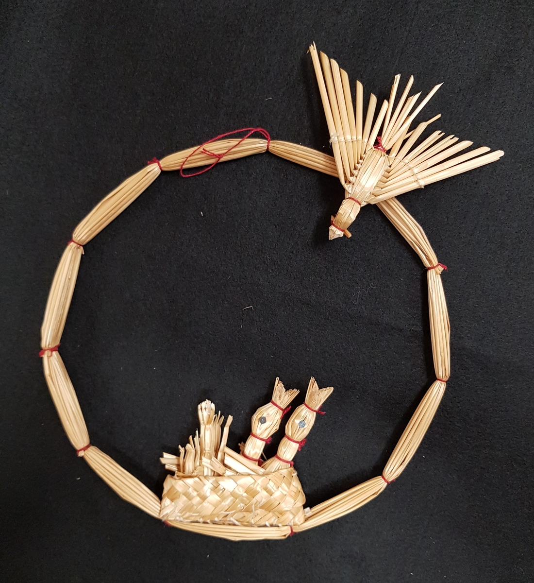• Den större fågeln har cederträ i näbben (gn Vivi Täckholm). Senare anv. tändstickor. Idé Erlad Borglund. Ingår i halmdokumentationen 1983.