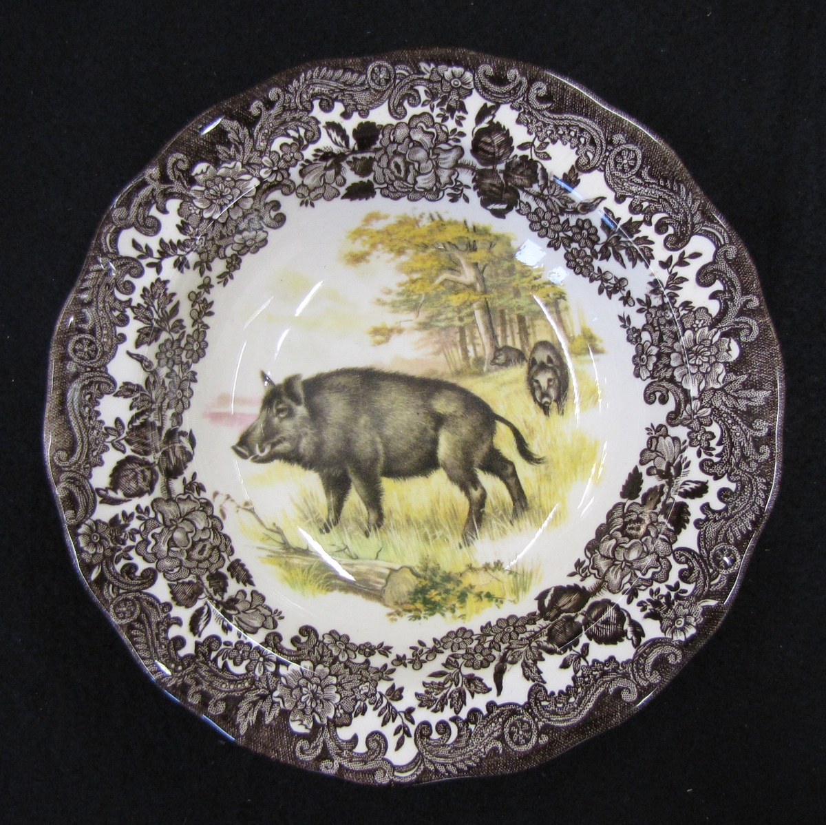 Denna tallrik har djurmotiv (vildsvin) och brun blomdekor på brättet.