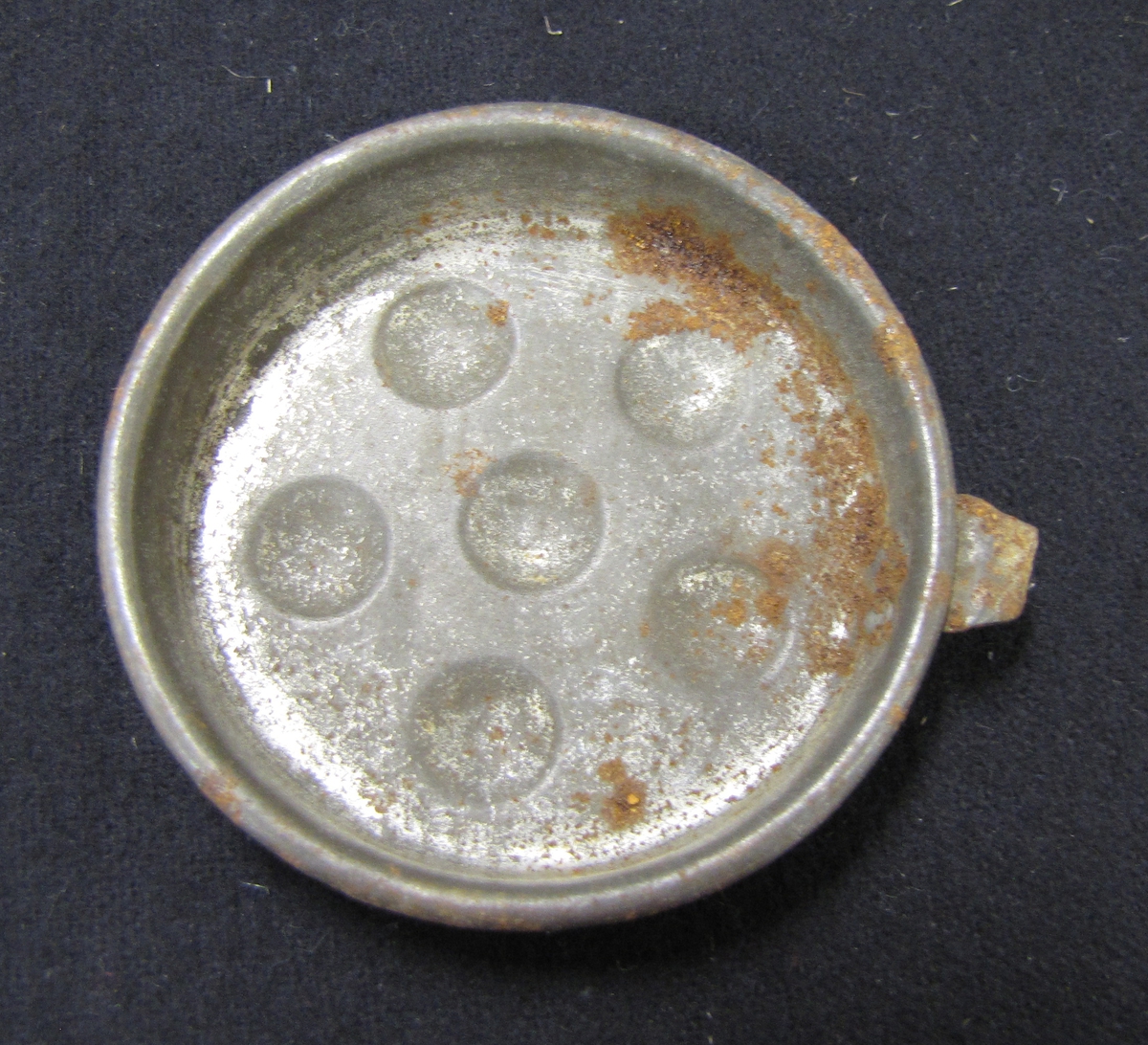 Ingår i en samling av diverse köks - och hushållsutrustning omfattande grytor, plättlägg, skurbräda, stekpanna, bakformar, m m. Totalt 12 föremål. Samtliga är huvudsakligen tillverkade av metall.
