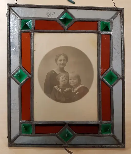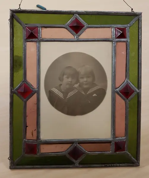 Två porträttfotografier, positiva bilder på glasplåt. Fotografierna är konstfullt inramade i blyinfattade glasramar med röda och gröna glasstycken. Ytterkanterna är klädda med järnlist. Porträttfotogr...