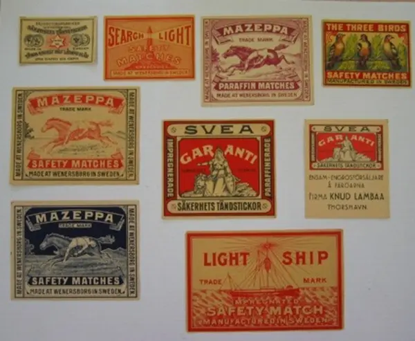 • Etiketter med olika motiv för olika tändsticksaskar, tillverkade på Wenerborgs tändsticksfabrik.