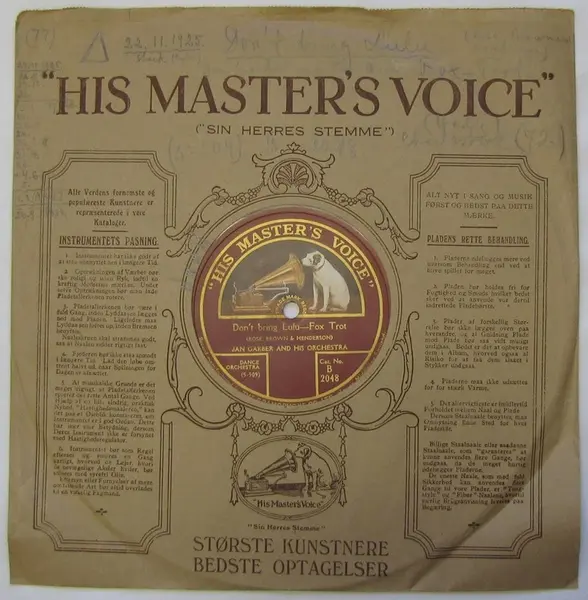 Företaget ''The gramophone Co. LTD (under dess svenska namn ''Grammophon'' och HMV (under dess svenska namn ''Husbondens röst'') gav ut de akustiskt inspelade musikstyckena ''Don't bring Lulu - Fox Trot'', komponerad av Rose Brown & Henderson och framförd av Jan Garber och hans Orkester. Det andra musikstycket är ''If you knew Susie(Like I know Susie)'', komponerad av G. de Sylva och framförd av Jack Shilkret's orkester.
