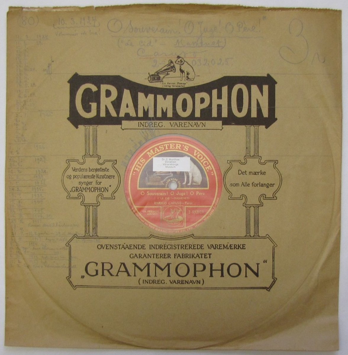 Företaget ''The gramophone Co. LTD (under dess svenska namn ''Grammophon'' och HMV (under dess svenska namn ''Husbondens röst'') gav ut det akustiskt inspelade musikstycket ''O Souverain! O Juge! O Père'', komponerad av Messenet och framförd av tenoren Enrico Caruso.
