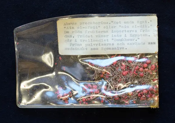 Abrus precatorius. "Mot onda ögat." "Ain el-afrit" eller "ain el-dik." De röda frukterna importeras från Sudan. Trädet växer inte i Egypten. Ingår i trollmedlet "Boukhuour." Fröna pulvriseras och används medicinskt som ögonsalva.