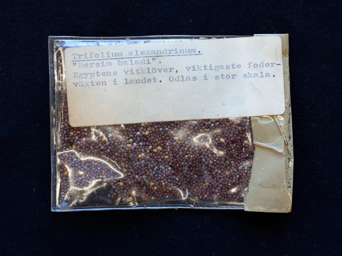 • Plastpåse innehållande frön. På påsen finns en klisterlapp med maskinskriven text: