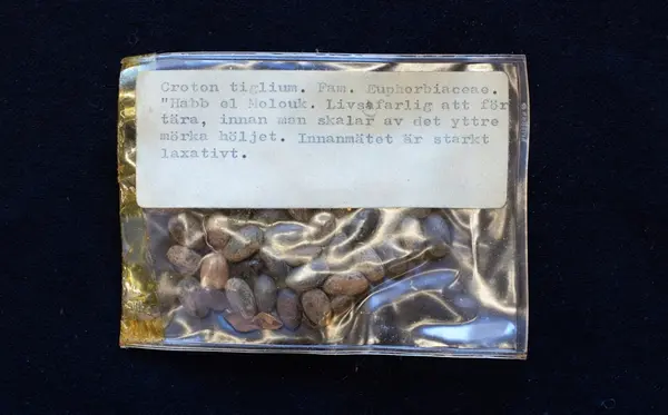 Croton tiglium. Fam. Euphorbiaceae. "Habb el Molouk. Livsfarlig att förtära, innan man skalar av det yttre mörka höljet. Innanmätet är starkt laxativt.