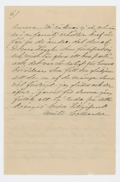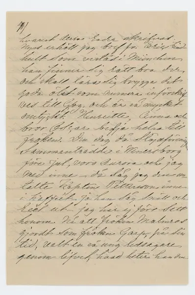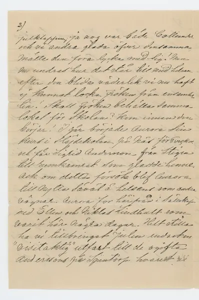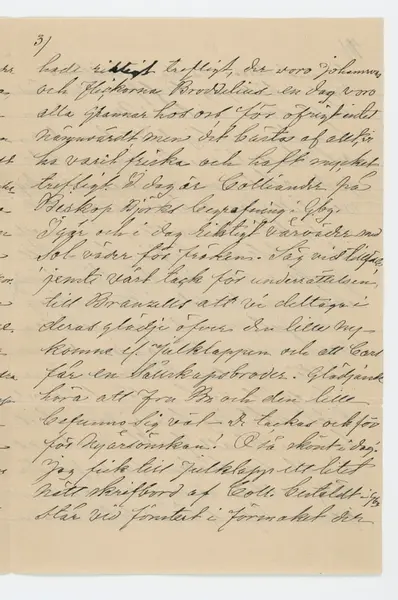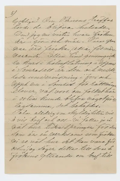 Brev skrivet till Johanna Brunsson 11/1 1888 från Emelie Colliander. "11/1 88. Goda fröken Brunsson! Hvar tog dit tillämnade besöket hit, vägen? Vi ha väntat och ej vetat hvart man hade att väna sig med bref, än tänkt att fröken var på Stigen el. Ängen el. på väg till oss. När blir nu detta? Tack så mycket för bref och det utm. fina, vackra kortet ... planchen samt alla goda önskningar hvars uppriktiga mening jag känner. Ja tack för allt, och måtte alltings store och gode gifvare förläna fröken ett lyckligt år med stärkta krafter till att åter ta' i tu med det arbete som intresset är så fästat vid; Jag hoppas att elever infinna sig, vore ledsamt annars. Roligt höra frökens glädje öfver julklappen; Ja nog var både Colliander och vi andra glada öfver densamma, måtte den föra lycka med sig! Men nu undras hur det står till med helsan efter den blida väderlek vi nu haft ej kunnat locka fröken från ensamheten! Skall fröken behålla samma lokal för skolan? Kom innan den börjar! I går började Aurora sin kurs i slöjdskolan på Näs för 6 veckor. och får Sigrid Andersson från Stigen till rumskamrat. som gladde henne. Ack om detta försök blef Aurora till nytta såväl å helsans som andra vägnar. Aurora for härifrån i sällskap med Ellen och Niklas Lindhult som varit här några dagar. Helt stilla ha vi tillbringat julen endast en "visitaktig" utfart till de ogifta Anderssons på Sjuntorp hvarut vi hade riktift trefligt, der voro Johanssons och flickorna Broddelius - en dag voro alla frannar hos oss, för öfrigt intet nämnvärdt, men det bästa af allt, vi ha varit friska och haft mycket trefligt. I dag är Colliander på Biskop Björks befrafning i Gbg. I går och i dag riktigt vårväder med sol - väder för frökens. Såg vid tillfälle jemte vårt tack för underrättelsen, till Branzells att vi deltogo i deras glädje öfver den lille nykomne ... julklappen och att Carl får en sällskapsbroder. Glädjande höra att bru Br och den lille befunno sig väl - Vi tackar och för för nyårsönskan! ... så skönt i dag! Jag fick till jullklapp ett litet nätt skrifbord af Coll. bestäldt i Gbg står vid fönstret i förmaket der hvarest dessa rader skrifvas. Nyss erhöll jag bref fr. Eric Lindhult som vistas i München han finner sig rätt bra der, och skall lära sig brygga det goda ölet som numera införskrifves till Gbg. och är så mycket omtyckt. Henriette, Anna och bror Oscar bedja helsa till fröken. Den dag då slöjdföreningen sammanträdde i Wenersborg före jul, voro Aurora och jag med inne - då såg jag den omtalte kapten Petterson inne i kafféet - ja han såg snäll och reel ut - jag har ej förr sett honom. Nå att fröken Malmros gjordt som fröken Garp, på sin tid, valt en så ung ledsagare genom livet, hvad heter han din lycklige? Om Persson träffas torde de blifva helsade. Om jag nu viste hvar fröken är - gör - och mår. Våra grannar äro friska, alla, för närvarande Ellen Lind genomfick en kurs i halmflätning å Upperud i somras ett år se´n och meddelade undervisning i Fors och Upph nu i somras för rätt många elever, väl vore om folket här i orten kunde blifva något företagsamma. det behöfdes. Tala alldrig om skyldigheter vis à vis bref och oss - vi gatta ju så väl hur tiden springer för den som är så verksam som fröken vi se väl hur det kan vara för oss - jag säger detta till svar å frökens yttrande om bref till Aurora - vi räkna ej så, och när en i en familj erhåller bref så får ju de andra del deraf. Owcar Hägg... som förlofvat sig och visst lär göra ett bra parti - ack, det var så roligt för hennes föräldrar som fått den glädjen att se en af de många snart väl försörjd ä jag glädes ock derröfver. Farväl för denna gång försök att ta' reda på detta krångel beder tillgifvnast Emilie Colliander."