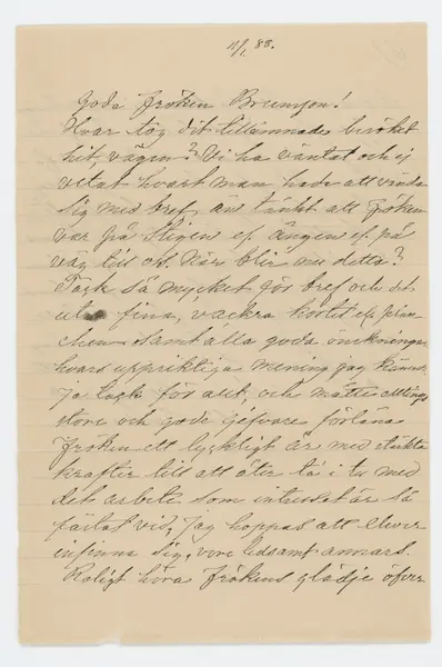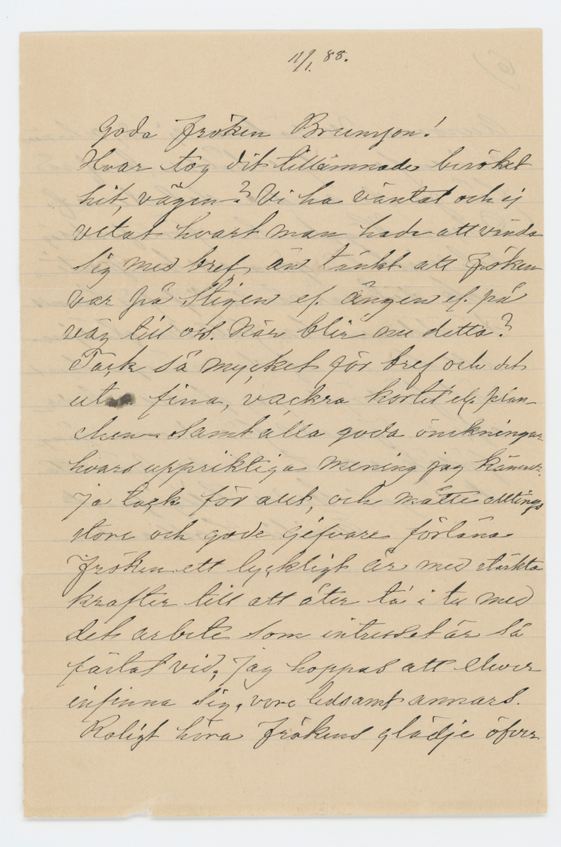 Brev skrivet till Johanna Brunsson 11/1 1888 från Emelie Colliander. "11/1 88. Goda fröken Brunsson! Hvar tog dit tillämnade besöket hit, vägen? Vi ha väntat och ej vetat hvart man hade att väna sig med bref, än tänkt att fröken var på Stigen el. Ängen el. på väg till oss. När blir nu detta? Tack så mycket för bref och det utm. fina, vackra kortet ... planchen samt alla goda önskningar hvars up...