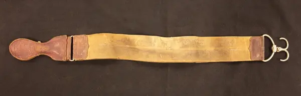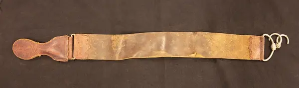• En strigel. Två vässningsremmar, en i textil och en i läder. Metallkrok för fästning i ena änden och en läderhandtag i den andra.