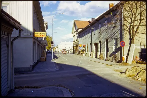 Detta diapositiv i färg är en del av den byggnadsinventering som gjordes i Vänersborg 1972. Motiven på färgbilderna visar oftast bebyggelse ur ett gatuperspektiv.
