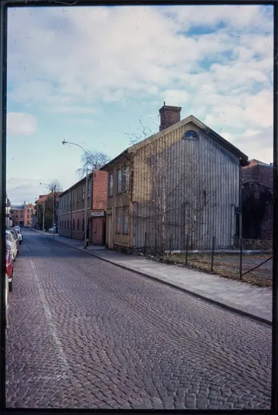 Detta diapositiv i färg är en del av den byggnadsinventering som gjordes i Vänersborg 1972. Motiven på färgbilderna visar oftast bebyggelse ur ett gatuperspektiv.
