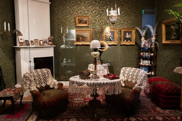 Miljön är en fri rekonstruktion av hur ett av Emelies mindre rum, en salong, kunde ha sett ut. Huset byggdes 1871 och inredningen är typisk för ett borgarhem under den oscarianska tiden. Möblerna står tätt i rummet, på väggarna hänger rikligt med familjeporträtt och andra målningar. Hyllor och bord är fyllda av prydnadssaker och på bordet ligger det obligatoriska fotoalbumet. Färgerna går gärna i rött eller grönt.