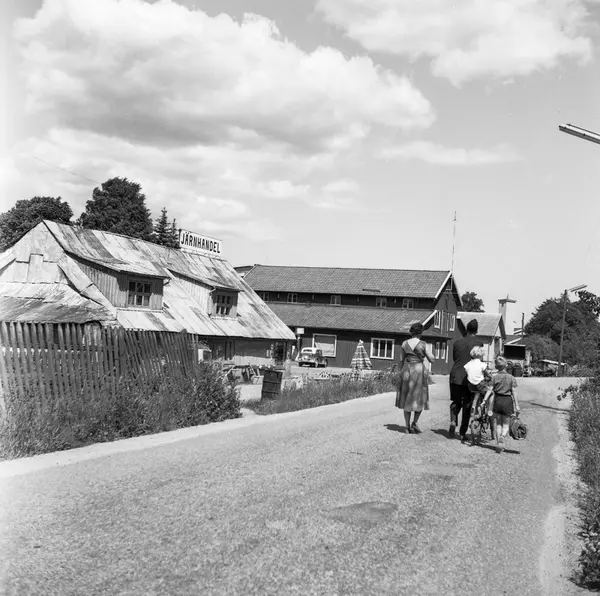 Text till bild: Stationssamhällets omvandling till Centrumbebyggelse. Vy mot öster. Till vänster ses Jacob Haegerströms Järnhandel öppnad 1918. En tid drev han här också en fågelholksfabrik. Byggnaden mitt i bild är Lerums elektriska, som startades 1912 av Gösta Fraenckel. Han var den som först såg till att intresserade Lerumsbor kunde få elektricitet. Antalet abonnenter var till en början fjorton men allt fler anslöt sig. Kommunen tog 1929 över verksamheten. Då hade Lerums elektriska drygt tusen kunder. Till höger skymtar brandstationens torn. Vägen rakt fram är Stationsvägen. Adelstorpsvägen går in åt vänster strax före Lerums elektriska. Foto 1960