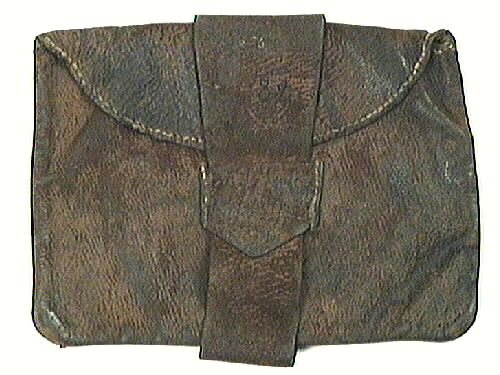 • Plånbok sydd av brunt läder som en väska med lock och ett fack. Stängs med läderflik i en "kanal".