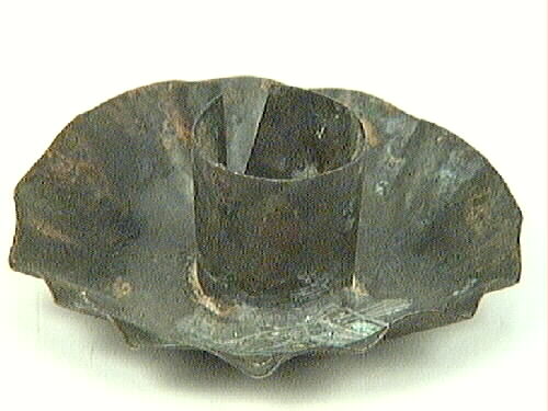 • Ljusstake, låg liten ljusstake troligen av bleckplåt. Liten plan bottenplatta med ljushållare. Vågformad kant omkring.