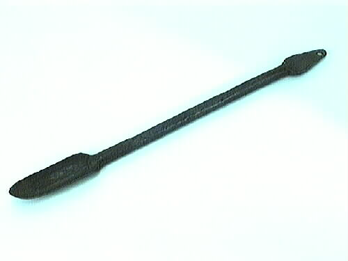 Navare med skålformigt borr, 120 mm långt och 39 mm brett. Där handtaget suttit är järnet platt och avsmalnande. Längst upp finns ett runt hål. 1985-07-16 Behandlad med Dinitrol.