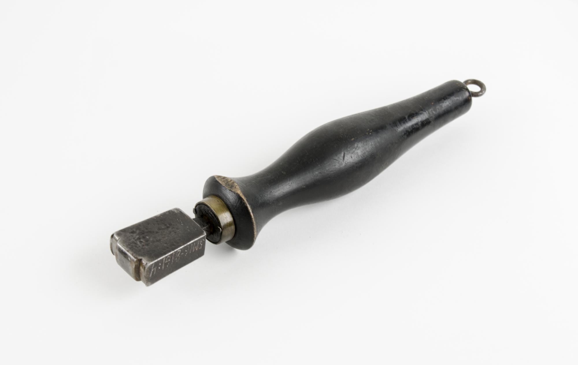 Fummel. Putsverktyg av järn med svarvat träskaft. Fummelns poleryta är något välvd och försedd med utskjutande del, ca 15x2 mm. En metallring är fastnitad i övre delen av skaftet. Träskaftet är svartmålat med nötningsspår strax under metallringen. En järnögla sitter längst ner på fummeln. Fummeln användes för formning och polering av kanter och ytor på skor. Föromsnittet för polering av sulkanten ...Visa hela