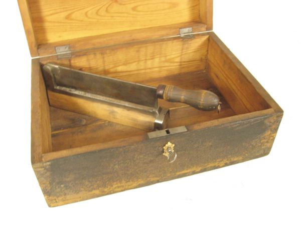 Sockerskrin (sockerlåda) av trä. Platt lock. Väggarna samt locket sinkade. Locket gjort av två brädor, fastpluggade i lockets ram, och en smal list. Botten av två brädor, fastpluggade i väggarna. På locket ett handtag med beslag i mässing. På lockets framsida en mässingsknopp. Två gångjärn. Fint skuret låsbeslag av ben fäst med två spik. Nyckel i låset. På en diagonalt placerad trästomme sitter hackanordningen. Kniven har ett svarvat, profilerat handtag. Brandskador på utsidan, främst på lockets vänstra del. I sockerskrinet hackades toppsockret till bitar.Stäng