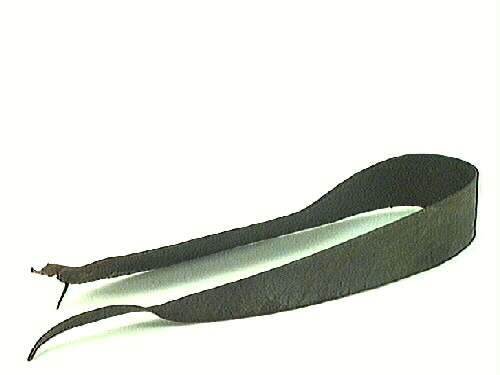 Rakstrigel skuren i läder. Avlång och avsmalnande med jämn tjocklek. Den breda änden är avsmalnande med rak ände. Där sitter en liten läderbit fast med en 20 mm lång spik. Biten har två hål, medan remmen har två par hål i änden. Den andra änden är spetsig. Färgen är svart, den lilla läderbiten är brun. Användes att vässa rakkniven på. Ena änden sattes på en vägg medelst de två spikarna eller så hö...Visa hela