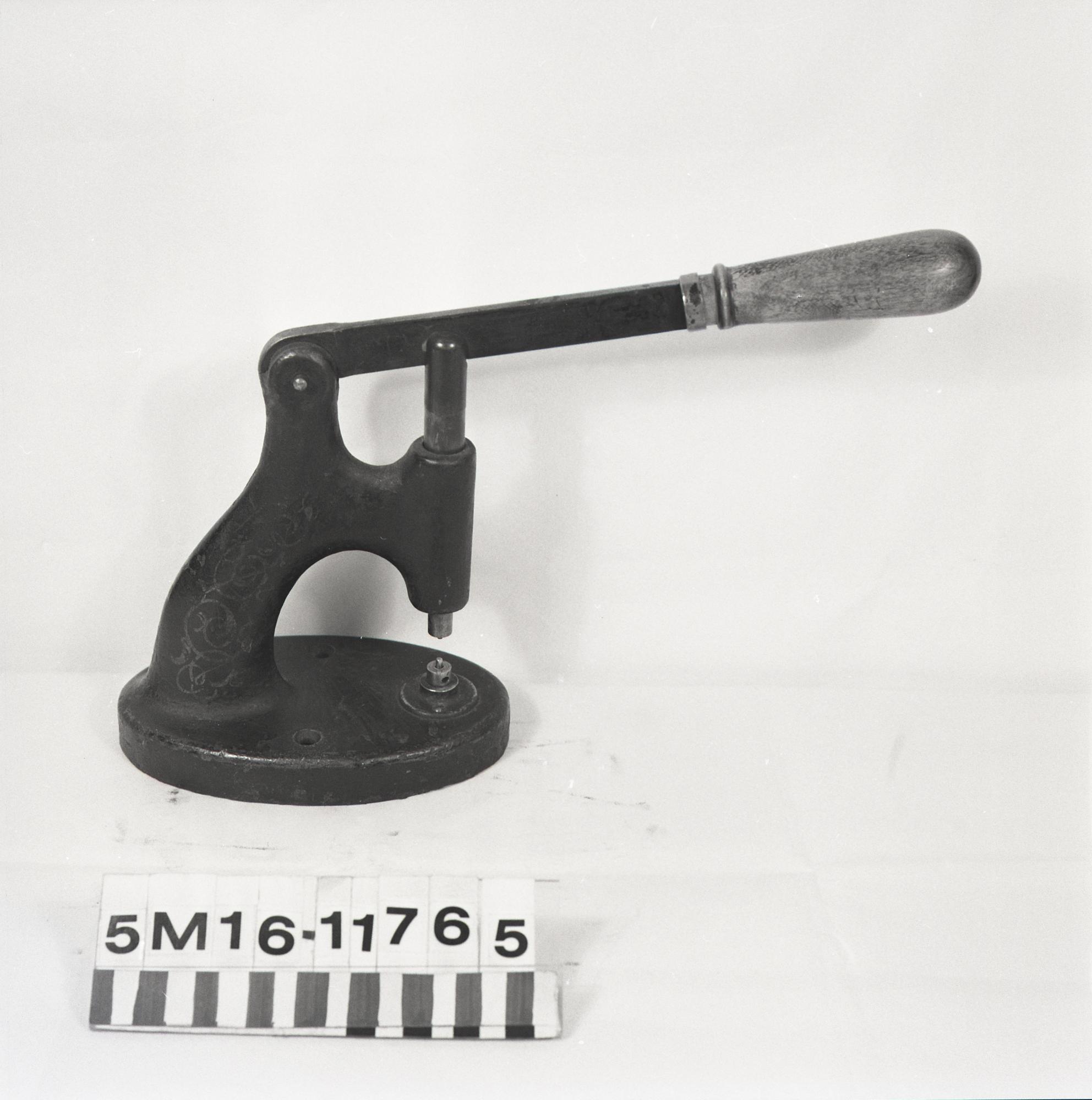 Märlapparat av järn. Oval grundplatta. Svarvat trähandtag på den arm som reglerar haålslaget, detta förstärks med en märla. Apparten svartmålad med slingrande dekorationer i guldfärg. Två hål i grundplattan för fastsättningen i underredet. Ingår i samlingarna "Gustav Svenssons Accidenstryckeri" på Limtorget. Tryckeriet startade i Grästorp 1878 och drevs isitt ursprungliga skick fram till 1975. Si...