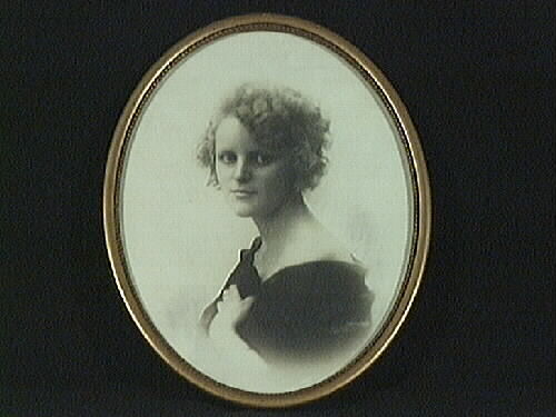• Porträttfoto med ram. Oval, smal och förgylld ram med pärlstav. Fotografiet är retuscherat. Den avbildade Rut Lövberg var anställd som kontorist hos häradsskrivare Nelsson. Han flyttade senare till Amerika. Uppgiftslämnare Stina Artig, Grevhusgatan i Lidköping.