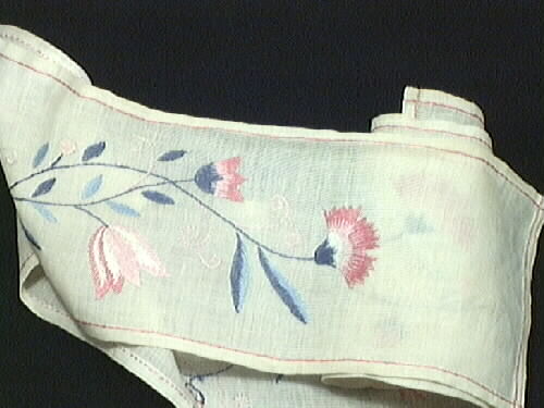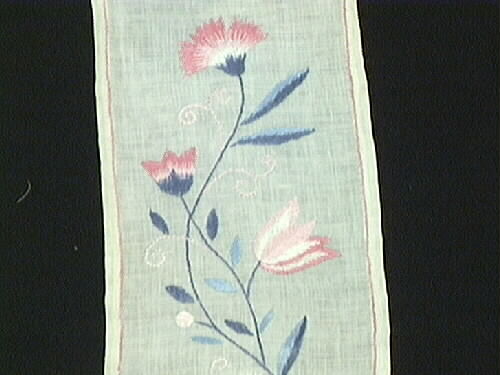 Festremsa, i vit linneväv, broderad med linnegarn i färgerna rosa, ljus- och mörkblått, vitt och rött. Tillhör en personlig samling med olika arkivalier från Lisa Meléns liv såsom bokmanus och tidningsutklipp. Samlingen innehåller dessutom olika duk, väv, broderi, spets, virk, band och sömnadsprover mm. Lisa Melén (*1917 +1987) var verksam som hemslöjdschef för hemslöjden i Lidköping alltsedan den öppnade 1948. Hon var även en produktiv författarinna och uppskattad kursledare. Samlingen är skänkt till Vänermuseet av Lisas make, Gunnar Melén. Källa: Lisa Meléns arkiv, Vänermuseet.