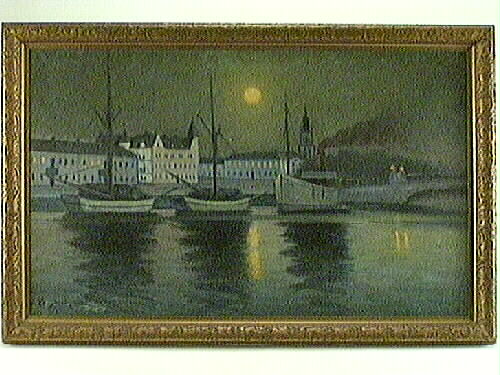 Målning med ram. Motiv: Månsken med båtar vid kaj på Gamla Stadens sida. Ledfyrarna på körbron är tända. Dunkla färger med tryckskador och ringar. Träram med guldfärgad pastellage. Museet har tidigare förvärvat kolteckning och pastell med liknande motiv tillverkande 1900 och 1901.