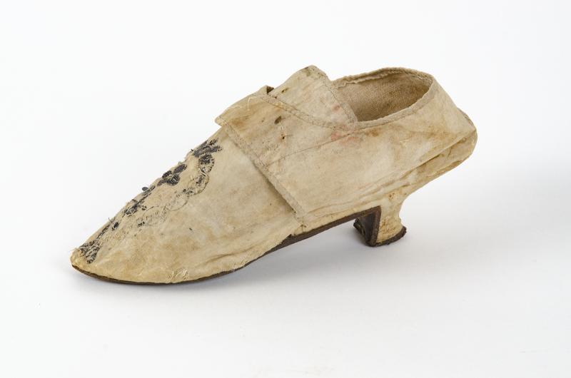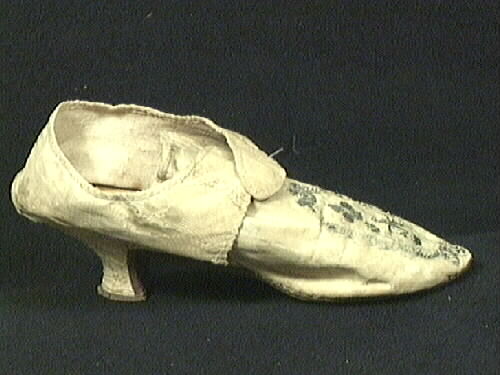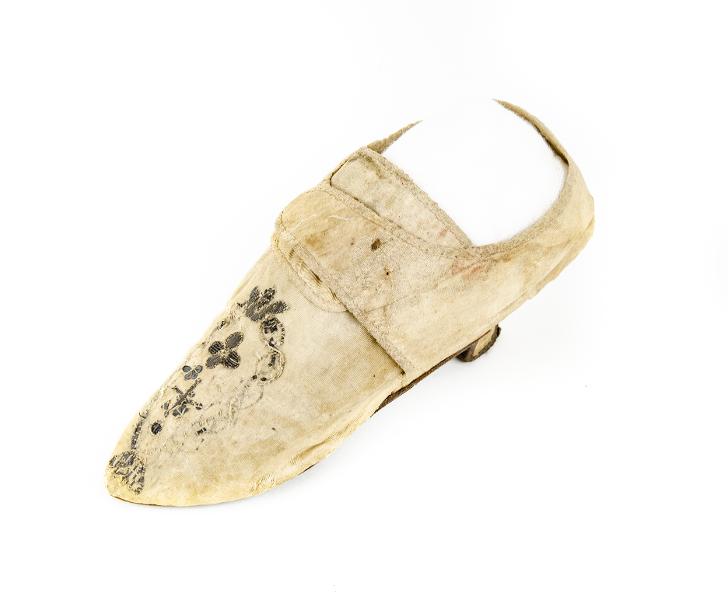 Damsko av vitt mönstervävt siden, plös med sleifar över. Broderad med silvertråd och silverpaljetter. Fodrad invändigt med linnetyg i tuskaft. Trälack klädd med siden. Sula av läder med "pinnhålsstämplar". Sunnerby står skrivet med blyerts undertill. Pappersetikett med siffrorna 24:7. Konserverad 1992: se rapport. Konserveringsnummer 272. Se även Kulturen 1940 sid 108ff.