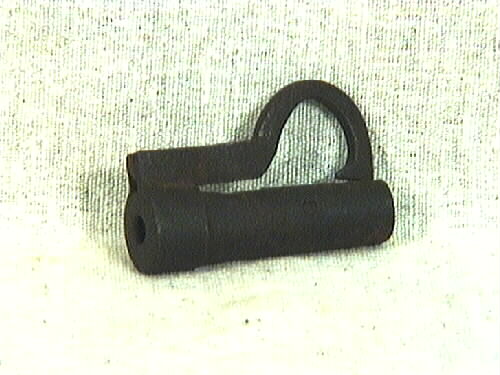 • Bultlås av järn med svängd bygel. Bygeln är fäst i ett cylinderformat block. Nyckel saknas. Behandlat med paraffinolja.