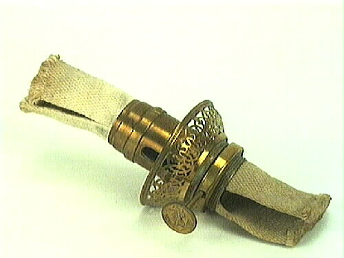 Brännare till fyr av mässing. Brännaren har cylinderformad kropp med ett reglege för veken i toppen. Kroppen är försedd med en konvex krage. Kragen har en kraftig veke som löper igenom hela kroppen. Brännaren har använts i en fyr.