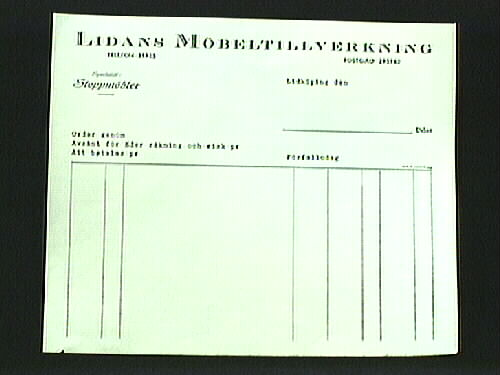 Debeteringssedel. Tryck upptill (jmf 015541): "LIDANS MÖBELTILLVERKNING TELEFON 219 05. POSTGIRO 295960 Specialité. Stoppmöbler Lidköping den". Därunder: "Order genom.... Avsänt för Eder räkning och risk pr.... Att betalas pr... .....Debet. Förfallodag... WEPE TR. LIDKÖPING 852" t h på mitten. Andra halvan kolumner.