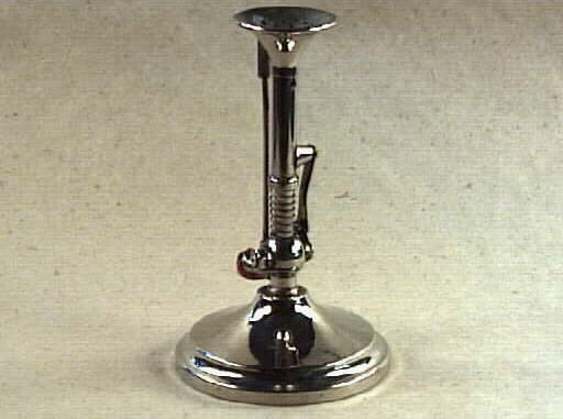 Gasbrännare. Perforerad, rund platta på hög fot. Fjäderbelastad. Föremålet kommer från Herrmanns frisersalong, Älvgatan 6, Lidköping. Dess sista ägare var Ebbe Lugner som 1982 tog över efter tre generationer Herrmann. Salongen startade 1861 och lades ner 31 december 1993. Källa: Vänermuseets arkiv, 305.
