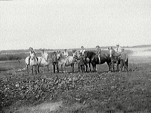 Gården Öboängens hästar, 8 hästar fanns i deras stall, ägare var Johan Fredrik Dahlstrand. Fick rida in dessa sex hästar från hagen när de skulle hem för natten. Från vänster sittande på hästarna, Maj-Britt Ander, Rigmor Ander på hästen Sonja, Gösta Bergwik(?), Jungmarker, Gunvor Bergwik och Gunnar Ander på hästen Kalle. (De stående personerna ej namngivna (troligt Nils och Einar Dahlstrand i blåb...