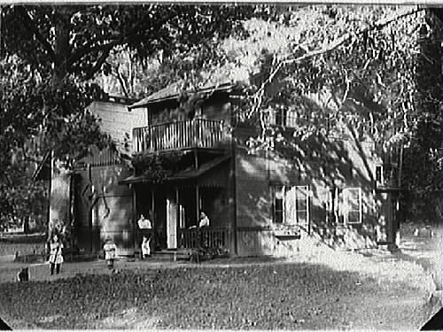 Grupporträtt av, från vänster: Maj-Britt, Gunnar och Rigmor Ander, Elna Fagerström samt Ester Ander utanför Simon Anders fotoateljé vid Råbäcks Turisthotell på Kinnekulle. Huset, som användes sommartid, bestod av ateljé, rum, kök matveranda, hall och en öppen veranda på bottenvåningen samt två sovrum på övervåningen.