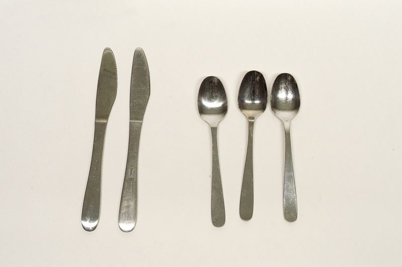 Matbestick designade av Theresia Hvorslev för Flygbolaget SAS i rostfritt stål. Märkta 18-8 Theresia. SAS 1-2. Kniv med sågtandat blad och svagt böjt, platt skaft. 3-4. Destsked med samma svaga böj på skaftet.