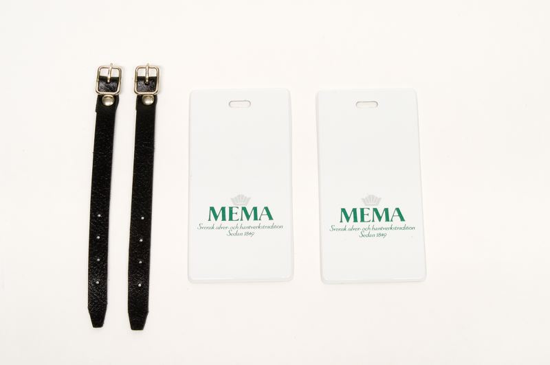 Två stycken adresslappar i vit plast med remmar till. På adresslappen är tryckt MEMA, Svensk silver- och hantverkstradition sedan 1849 i grönt. På basidan en ficka i klar plast för adressuppgifter. Rem i vävburen, svart plast med spänne i vitmetall fastratt i remmem med en blank nit.