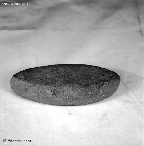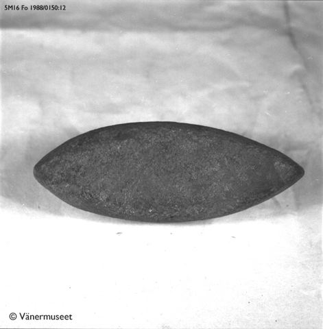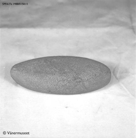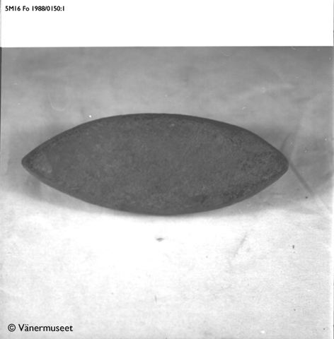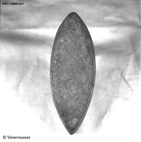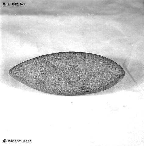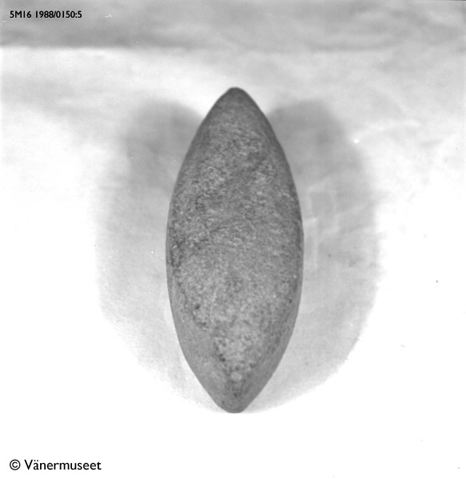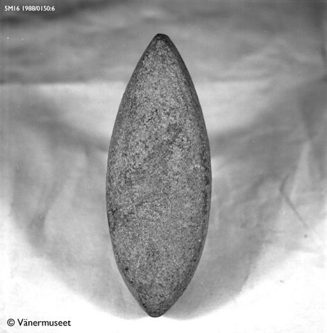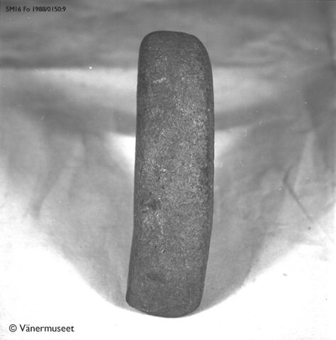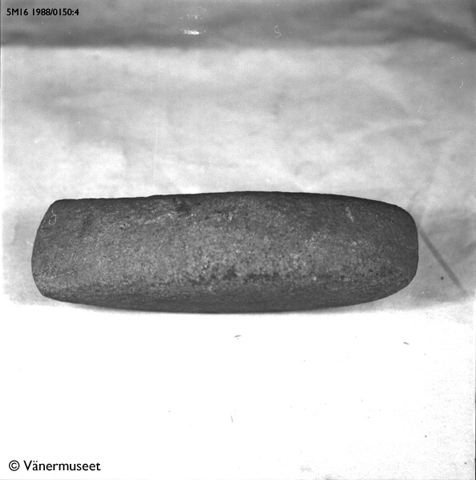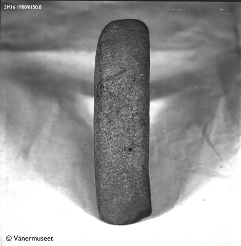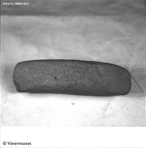 Dokumentation av yxa av stenart funnen våren 1987 vid Frielsberg 1:1, Friels socken, nordväst Lilla Goentorp vid Snärjet. Något påminnande om båtyxa, saknar skafthål. Spår efter användning på eggen. Mått: L: 150 mm B: 55 mm H: 45 mm.