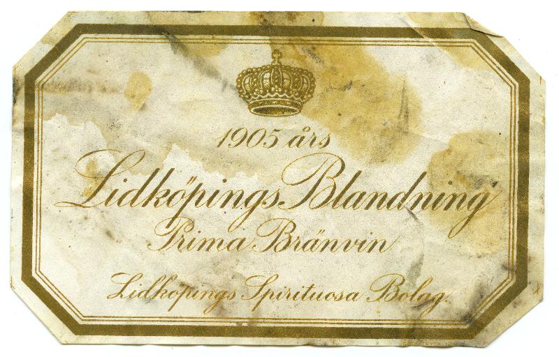 Spritetiketter. Överst en krona, därunder texten: "1905 års Lidköpings Blandning Prima Brännvin Lidköpings Spirituosa Bolag".