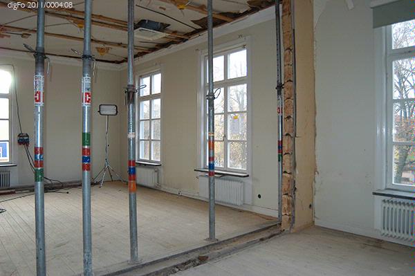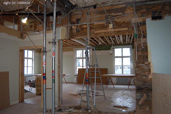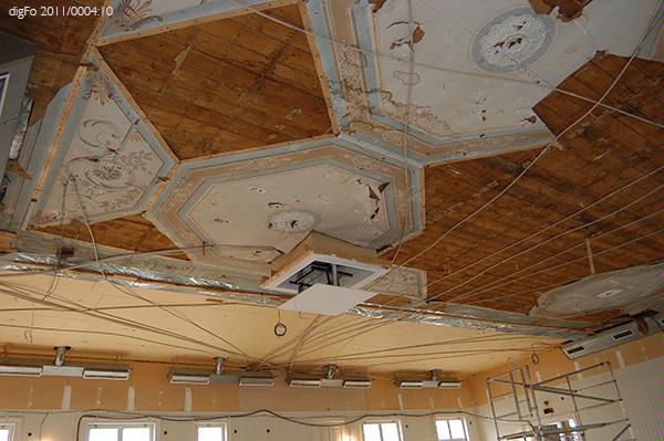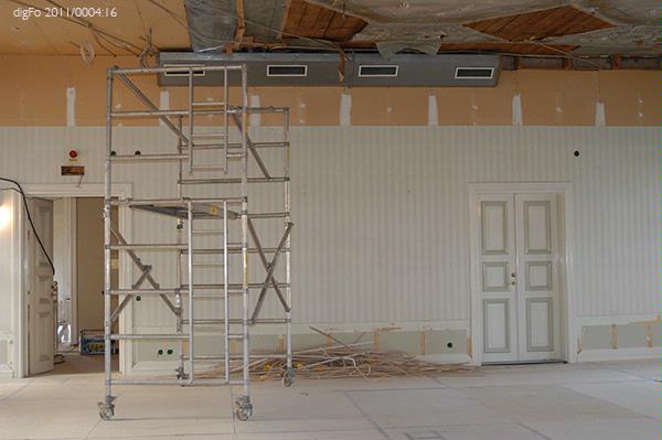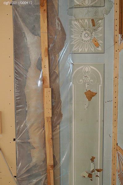 Dokumentation av Lidbeckska huset under renovering hösten 2011. Bild 1-3. Timmervägg vid gårdsentré. Vänermuseet har tagit en dit av tapetväggen till samlingarna. 4. Vy från främre entrén mot norr, sammanträdesrum. 5. Entré, bottenvåningen, hisschakt. 6. Entré, bottenvåningen. Trappan upp till övervåningen till vänster i fonden. 7. Övervåningen. Hisschakt till vänster. Dubbeldörr till fullmäktigesalen i bilden mitt. 8. Mellanvägg mellan de två caférummen borttagen. 9-15. Fullmäktigesalen, detaljer av taket med målad dekor på papper. Delar av denna finns i Vänermuseets samlingar sedan senaste renoveringen på 1980-talet. 16. Fullmäktigesalen mot väster. Dubbeldörren till vänster leder ut mot övre hallen och den till höger till Lidbeckska rummen. 17-19. Övervåningen, Lidbecksrummet i hörnet med de stora speglarna stående kvar.