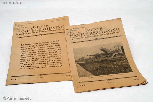 Svensk Hantverkstidning, Tidskrift för Sveriges Hantverksorganisation. Nr 12 och 14, 25 juni och 25 juli 1930. Brunt papper på utsidan. Nr 14 har en bild från Stockholmsutställningen på framsidan, samt artikel om jordbrukets maskiner mm. Flera sidor upptas av annonser. Tidningarna har adresstämpel på framsidan upptill, till vänster: Herr Kakelugnsmak. mästare Johan Svensson, Nya staden Lidköping.