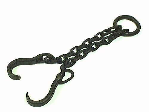 Kättingar, två, med varsin enkel krok i änden. Kättingarna löper båda på en järnring med 105 mm diameter. Varje kätting har en större märla i varje ände och däremellan tio stycken märlor 45 X 25 mm. Varje krok är gjord i plattjärn med ett mindre hål i övre änden för fäste av kättingen och den nedre änden är bockad till en krok. Krokarna har troligen använts vid arbete i hamnen. 1982 11 05: Rengjord och penslad med paraffinolja.