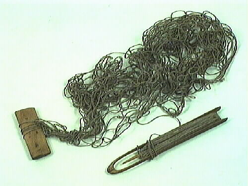 Nätkavel och nätnål med garn och nät, troligen tillverkning av en strut till en ryssja. Nätnålen är 185 mm lång, avlång träbit med två skalmar. Mellan dessa är en tunga utskuren 40 mm lång. Avståndet mellan skalmarna och tungan är ca 10 mm. I den andra änden går skalmarna ut på att garnet hålls på plats. Bomullsgarn är lindat på nålen. Nätkaveln är en rektangulär, konvex träbit med skarp kant på e...